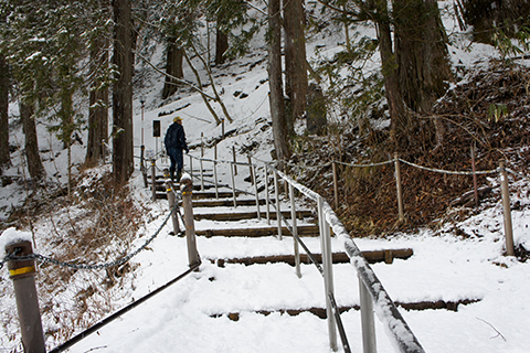 新滝は滝を裏から見る事ができるのが特徴で、冬場は凍った滝を裏から見ることができるという幻想的な風景に変わります。