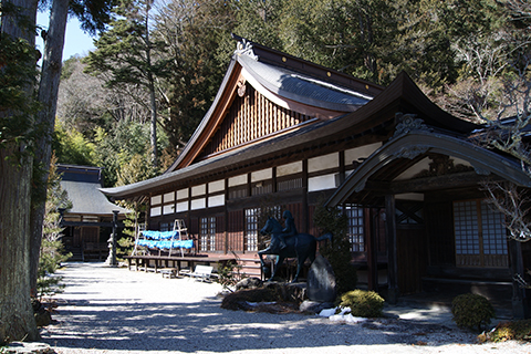 義仲館の前には木曽義仲と巴御前の銅像がある
